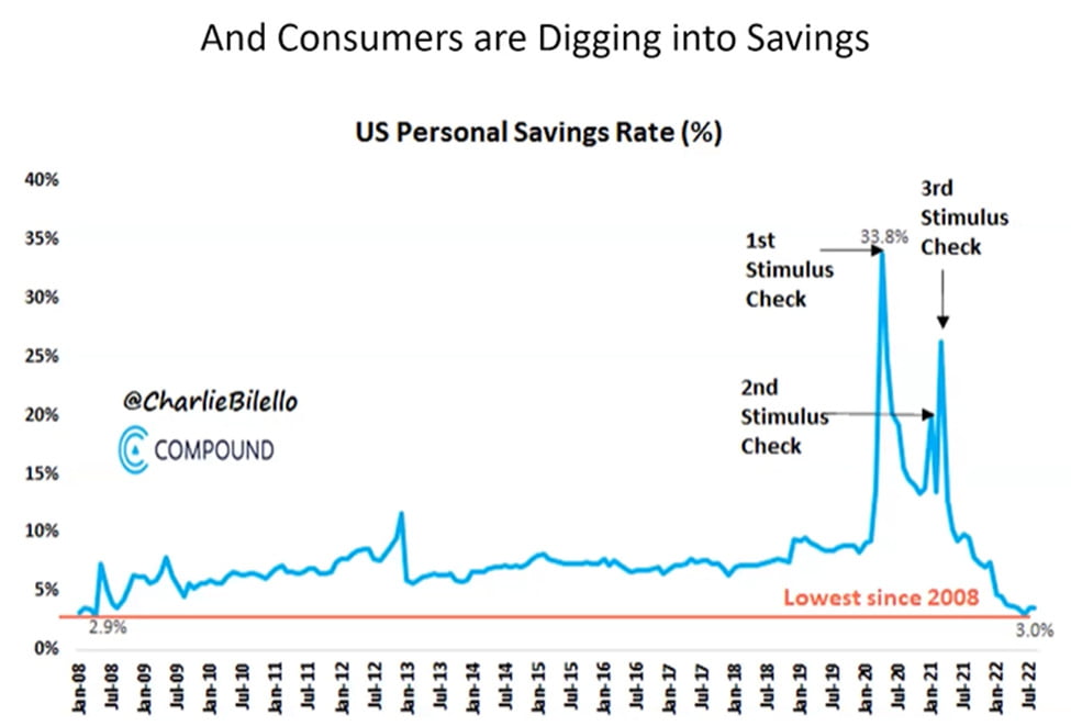 Savings are being depleted as consumers continue to spend. Also notice the pecks on this chart are the 1st, 2nd & 3rd stimulus checks that allowed them to get use to a level of spending/living.