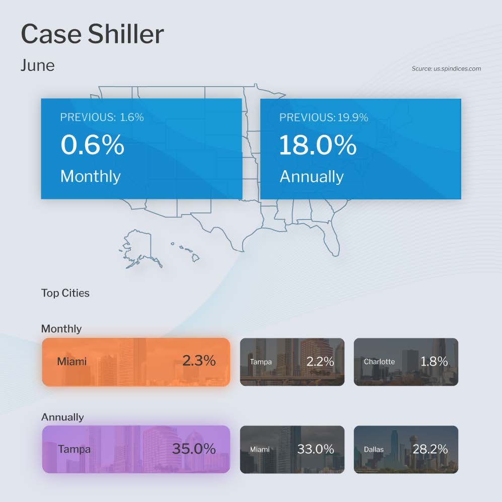 The Case-Shiller Home Price Index, which is considered the “gold standard” for appreciation, showed home prices rose 0.6% in June and 18% year over year. This annual reading is a decline from the 19.9% gain reported in May but still strong.