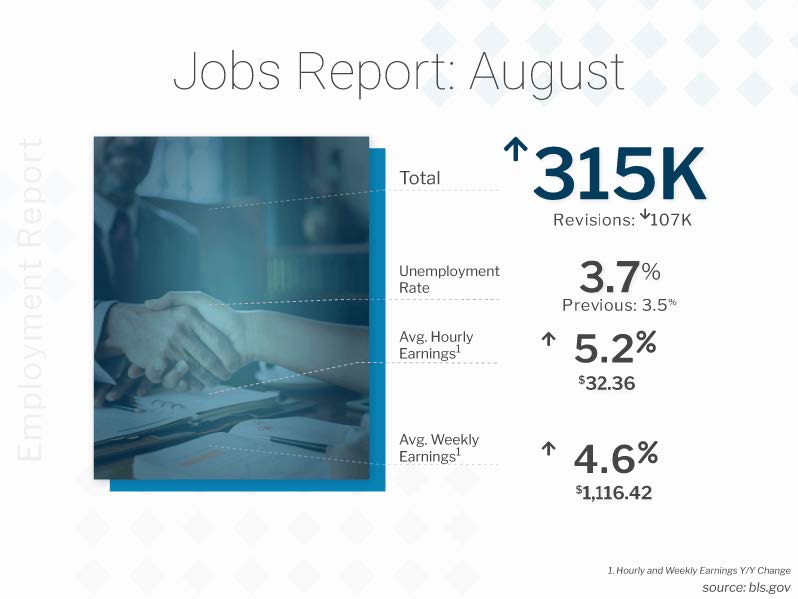 The Bureau of Labor Statistics (BLS) reported that there were 315,000 jobs created in August, coming in just above expectations of 300,000 new jobs. However, there were negative revisions to the data for June and July subtracting 107,000 jobs in those months combined. The Unemployment Rate rose from 3.5% to 3.7%, though this is partially due to the rise in the labor force, which increased by 786,000.